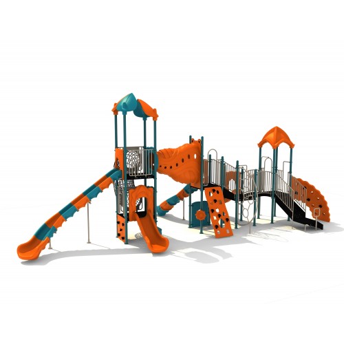 Minimo playgrounds are skillfully crafted with your choice of 3.5" OD galvanized steel or aluminum support posts which are, along with all of the steel handrails, barriers, gates, and climbers, coated with a baked-on polyester powder coat finish for a lifetime of protection against the elements. All steel decking and stairs are encased in a long-lasting PVC coating. The three-dimensional plastic slides, panels, roofs, and climbers are rotationally molded using virgin compounded resins that feature greater UV breakdown resistance than dry blended resins. The HDPE sheet plastic climbers and activities are specifically manufactured at the factory for high-quality control and not purchased from a supplier.
