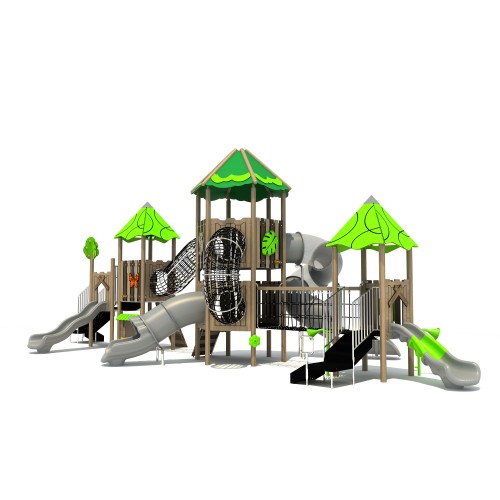 The large, sturdy Eco-Wood platforms can comfortably accommodate large volumes of kiddos without constricting enthusiasm. The rugged 4x4 extruded aluminum posts anchor the play in place and provide sturdy connection points for all play activities. The Eco-Wood posts are printed with the dye sublimation to simulate wood grain. They capture the look of wood while employing the strength and durability of the heavy gauge aluminum support. The metal gates and climbers are constructed with a heavy gauge, rust-resistant stainless steel. The flat sheet plastics used for the colorful barriers, icons, post toppers. and roofs are formed from fade-resistant HDPE. In contrast, the 3D plastic slides and climbers are rotationally molded using a virgin, compounded resigns to ensure the best UV resistance and long-lasting products. The wood-like barriers, decks, and roofs are cra????ed from a highly dense compact laminate and are laser cut to precision. This material resists corrosion, dents, scratches, and combustion and remains stable with UV exposure.