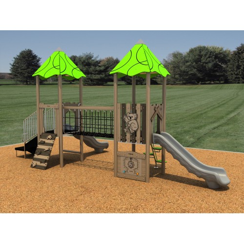 The large, sturdy Eco-Wood platforms can comfortably accommodate large volumes of kiddos without constricting enthusiasm. The rugged 4x4 extruded aluminum posts anchor the play in place and provide sturdy connection points for all play activities. The Eco-Wood posts are printed with the dye sublimation to simulate wood grain. They capture the look of wood while employing the strength and durability of the heavy gauge aluminum support. The metal gates and climbers are constructed with a heavy gauge, rust-resistant stainless steel. The flat sheet plastics used for the colorful barriers, icons, post toppers. and roofs are formed from fade-resistant HDPE. In contrast, the 3D plastic slides and climbers are rotationally molded using a virgin, compounded resigns to ensure the best UV resistance and long-lasting products. The wood-like barriers, decks, and roofs are cra????ed from a highly dense compact laminate and are laser cut to precision. This material resists corrosion, dents, scratches, and combustion and remains stable with UV exposure.